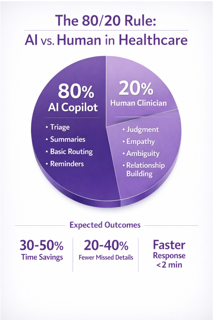 AI handles 80% of routine communication, humans oversee the critical 20%. Clinician approves or edits AI suggestions before sending. Escalation paths ensure nothing slips through unattended.